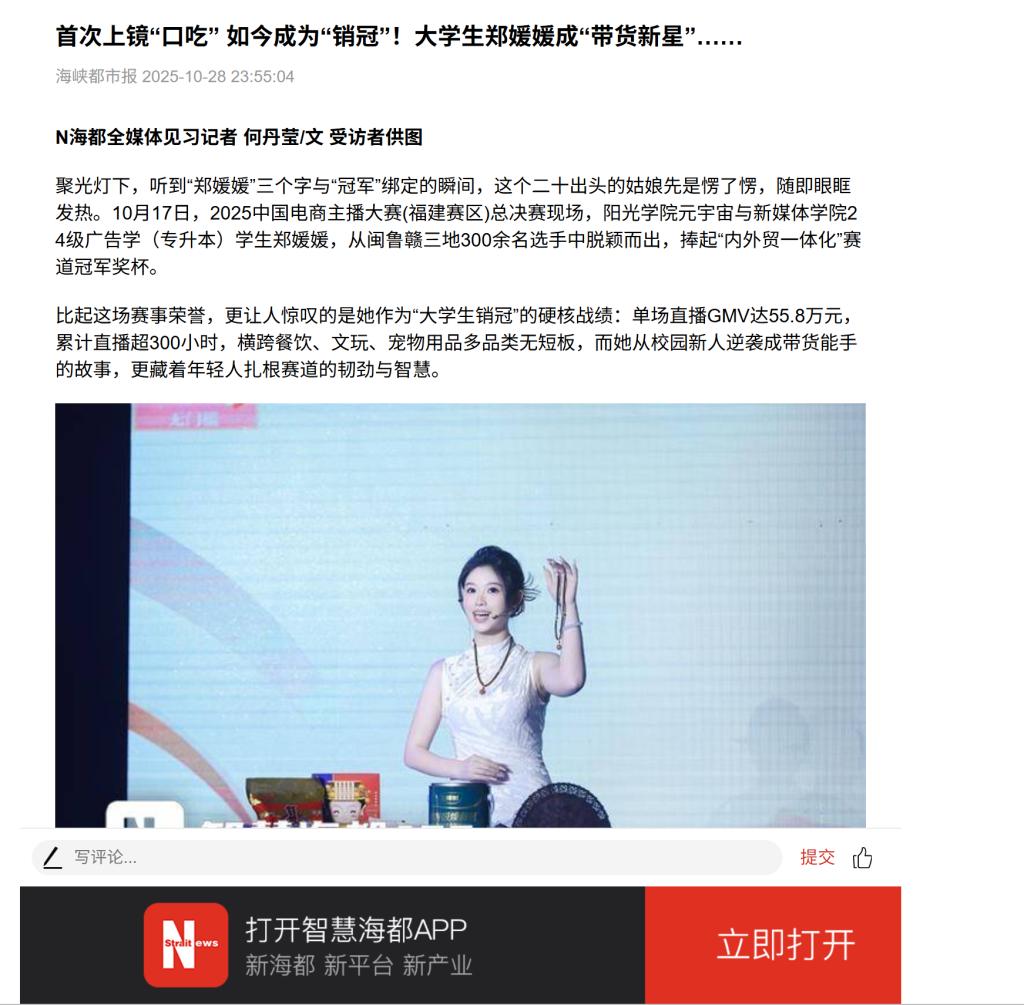 - 海峡都市报:首次上镜“口吃” 如今成为“销冠”!大学生郑媛媛成“带货新星”…… [2025-11-05]