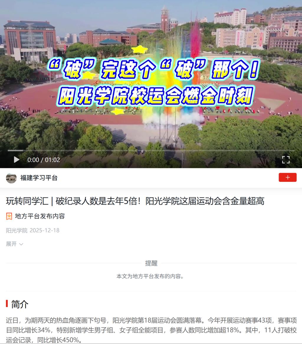 - 学习强国:阳光学院:破纪录人数是去年5倍!阳光学院这届运动会含金量超高 [2025-12-18]