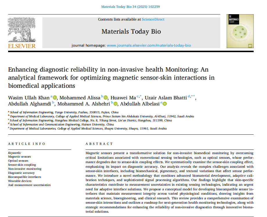 近日,我校信息工程学院Wasim Ullah Khan博士研究论文《Enhancing diagnostic reliability in non-invasive health Monitoring: An analytical framework for optimizing magnetic sensor-skin interactions in biomedical applications》被国际期刊《Materials Today Bio》(JCR 1 区,2024 年影响因子 10.2)录用。
