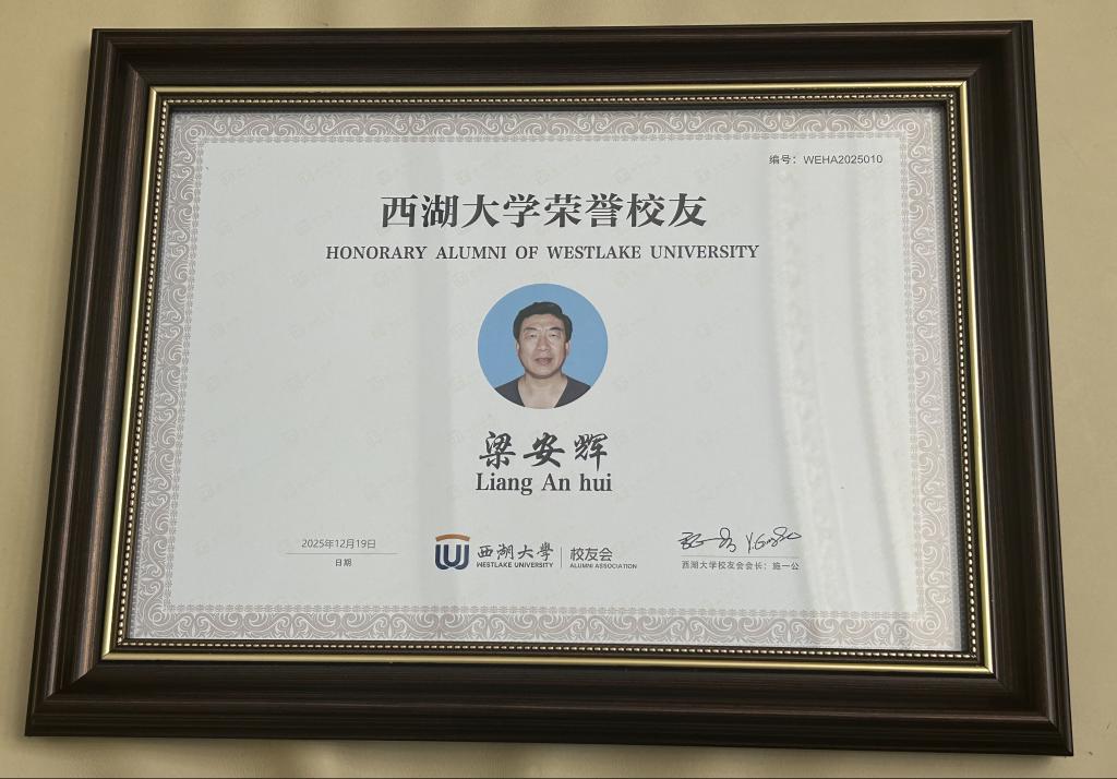 西湖大学校长、校友会施一公院士亲自梁安辉教授颁发西湖大学荣誉校友证书