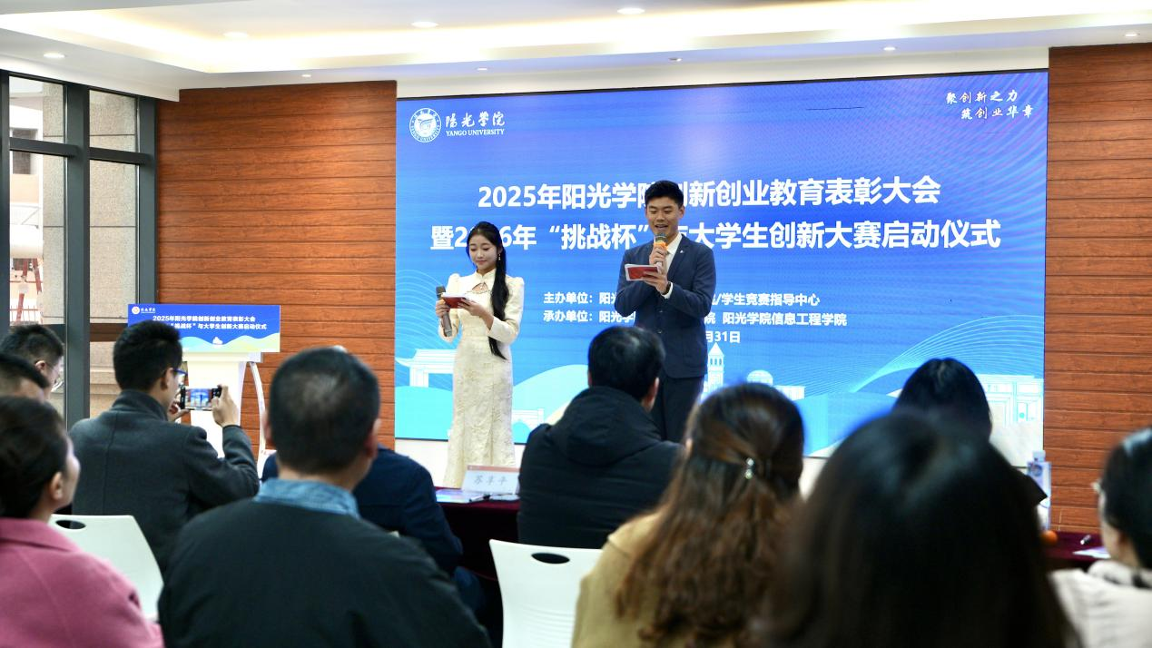 近日,2025年阳光学院创新创业教育表彰大会暨2026年“挑战杯”、创新大赛启动仪式在大学生创新创业园C108隆重举行。阳光学院党委副书记、校长助理杨海晋,阳光学院党委副书记苏享平,二级学院院长,党组织书记,学科竞赛分管领导,创新创业导师及师生代表齐聚一堂,共同见证年度双创硕果,携手开启创新实践新征程。