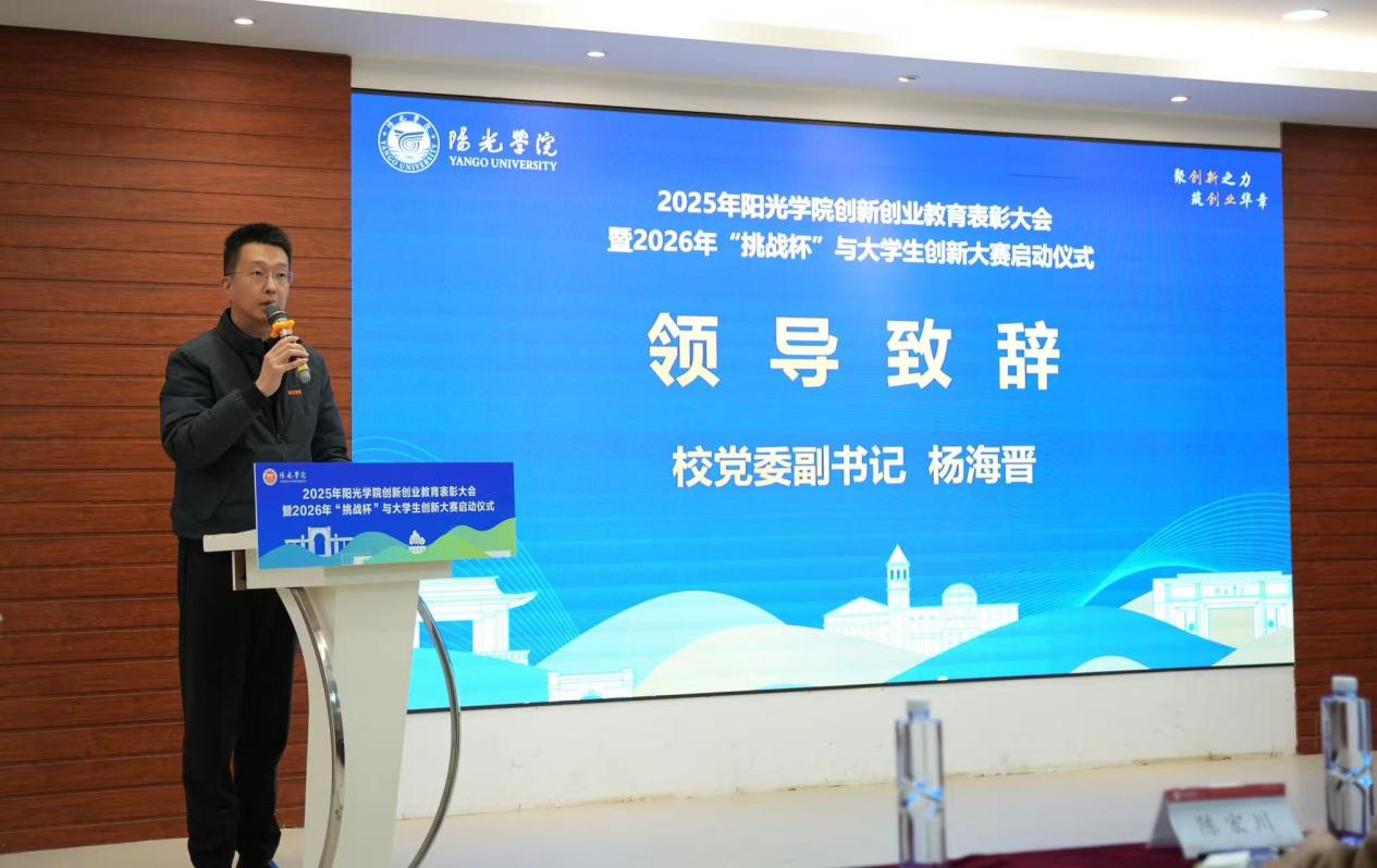 活动伊始,阳光学院党委副书记、校长助理杨海晋发表致辞,回顾了学校过去十四五双创教育领域的深耕成果及十五五规划和2026年工作要点,强调了产教协同育人对创新创业工作的重要支撑作用,全面推进全生命周期项目孵化,不断完善学校双创教育生态。