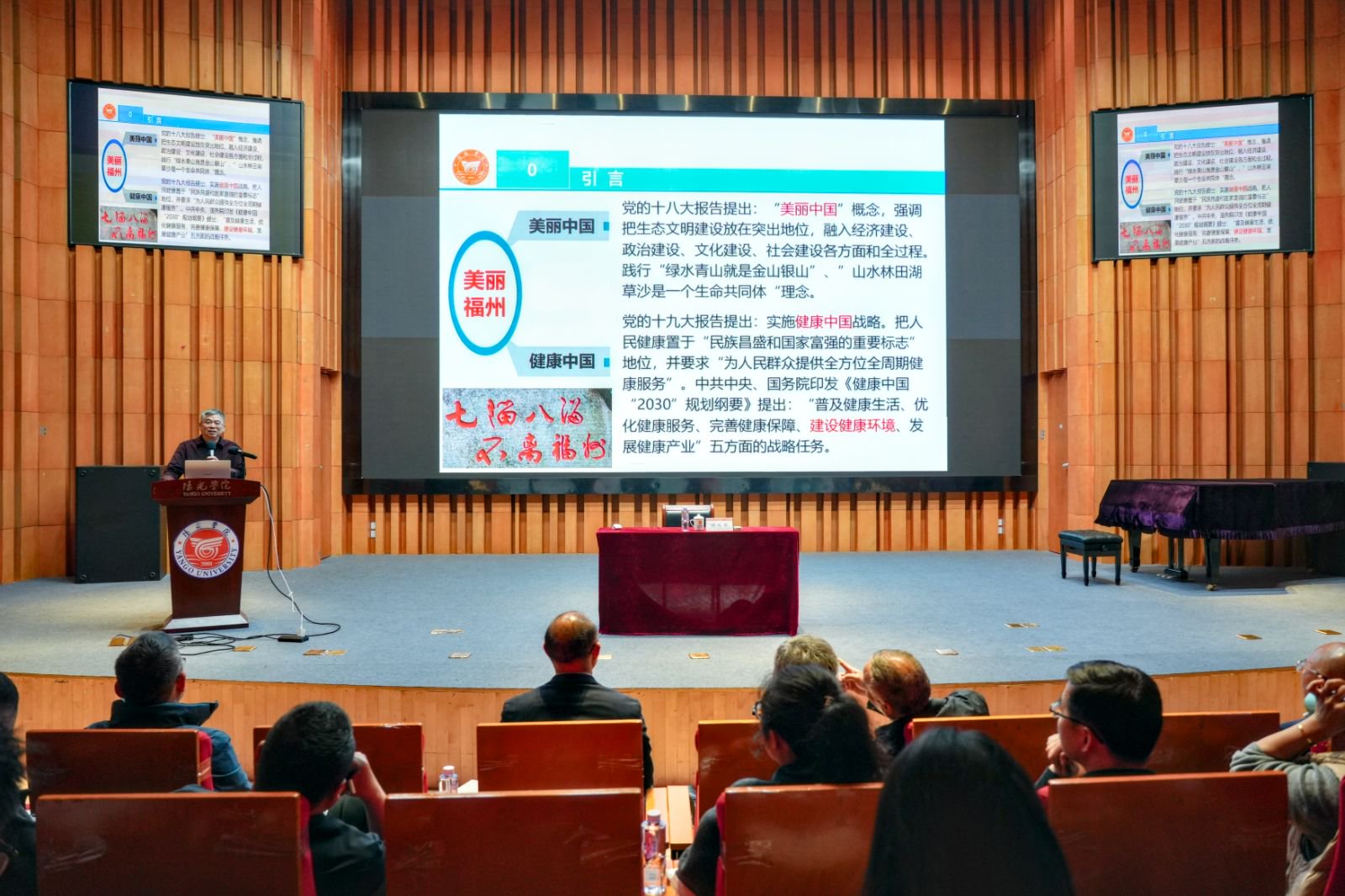 第二场讲座,林从华教授带来《美丽福州》专题分享。他以“福之历史、文化、青山、碧水、坊厝”为主线,串联福州建城2228年历史发展脉络,从昙石山文化遗存、闽越文化、三山两塔一条街古城格局,到三坊七巷古韵、船政文化荣光,再到全球可持续发展城市奖(上海奖)56个实践案例分享,以丰富史料、实景案例全方位展现福州的历史底蕴,让师生沉浸式感受闽都建筑文化魅力,对福州城市建设发展有了全新认知。