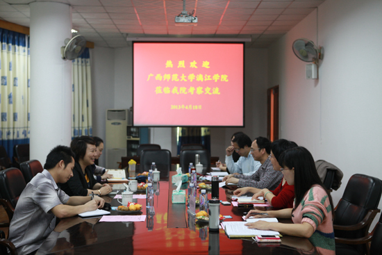 4月18日下午,广西师范大学漓江学院教务与科研管理处副处长杨庆庆一行3人来我院考察交流。院长助理兼人事部主任张红霞,教学质量管理办公室主任林荣文、教务部副主任柯燕华及法律系主任林发新参加了交流座谈。