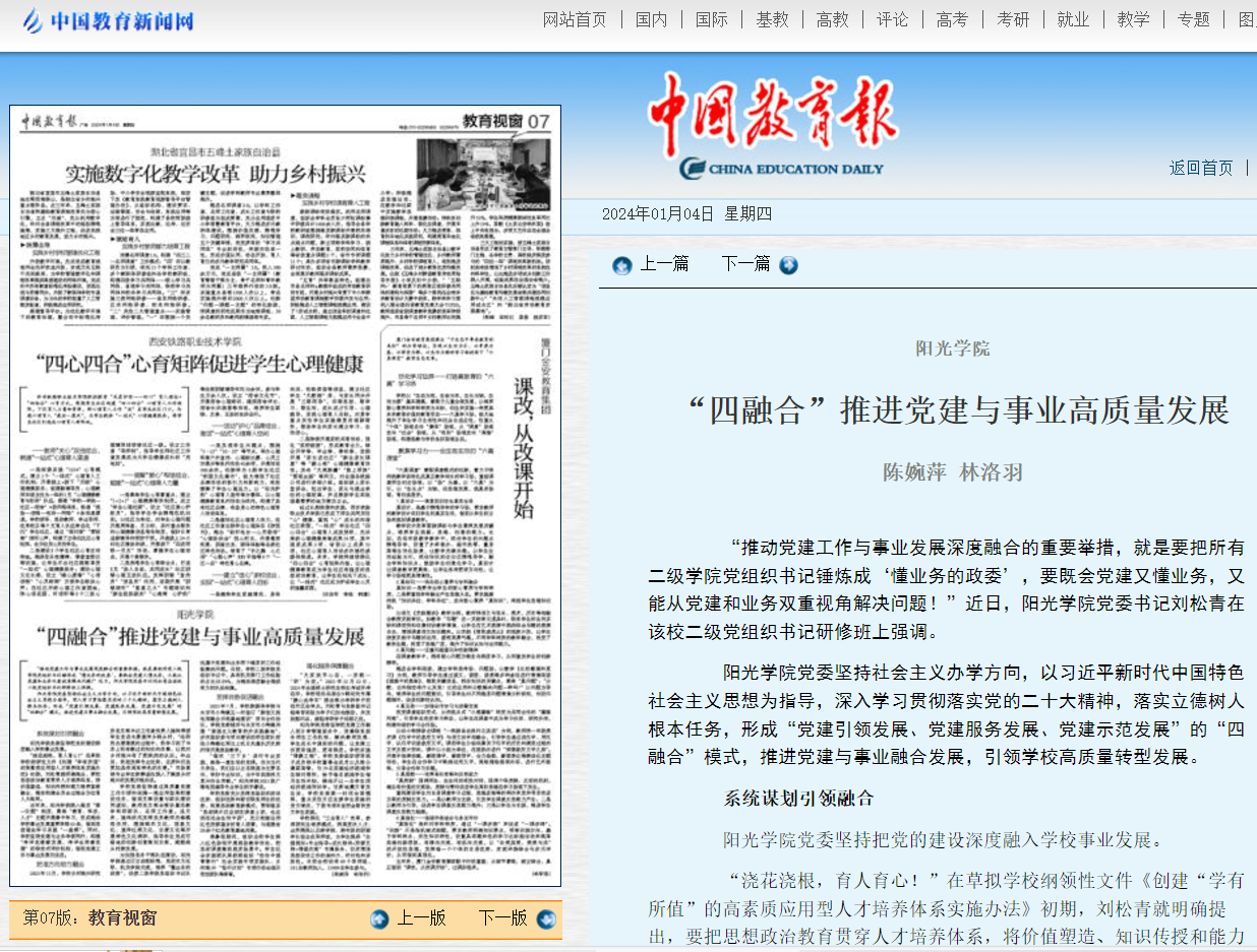 1月4日,中国教育报以《“四融合”推进党建与事业高质量发展》为题,深度报道阳光学院坚持社会主义办学方向,落实立德树人根本任务,不断创新党建工作体系,形成“党建引领发展、党建服务发展、党建示范发展”的特色“四融合”模式,推进党建与事业融合发展,引领学校高质量转型发展。