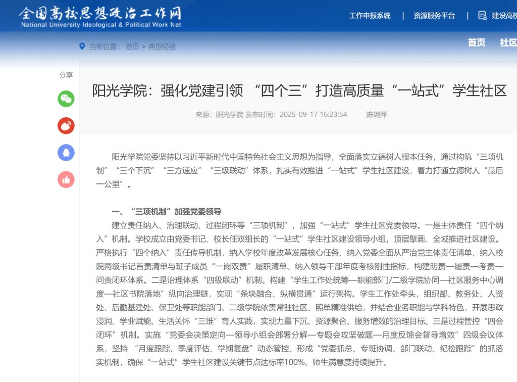 全国高校思想政治工作网:阳光学院:强化党建引领 “四个三”打造高质量“一站式”学生社区