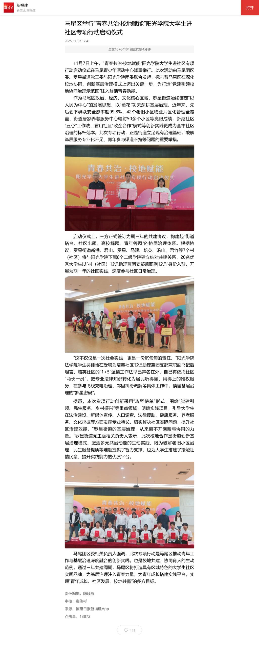 新福建:马尾区举行“青春共治·校地赋能”阳光学院大学生进社区专项行动启动仪式