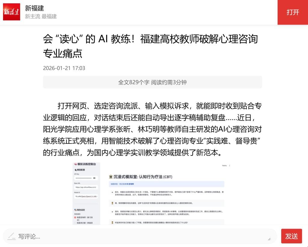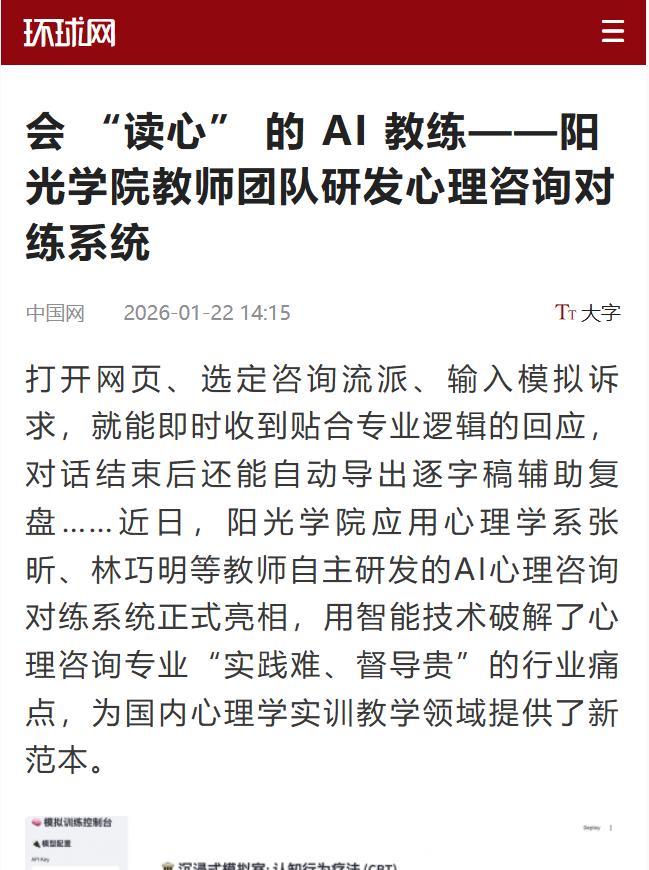打开网页、选定咨询流派、输入模拟诉求,就能即时收到贴合专业逻辑的回应,对话结束后还能自动导出逐字稿辅助复盘……近日,阳光学院应用心理学系张昕、林巧明等教师自主研发的AI心理咨询对练系统正式亮相,用智能技术破解了心理咨询专业“实践难、督导贵”的行业痛点,为国内心理学实训教学领域提供了新范本。