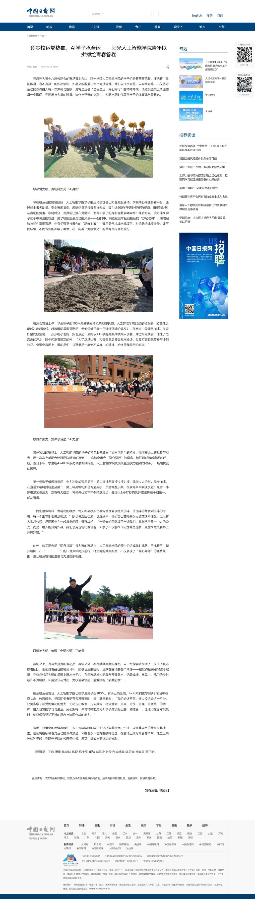 中国日报网:逐梦校运燃热血,AI学子承全运——阳光人工智能学院青年以拼搏绘青春答卷