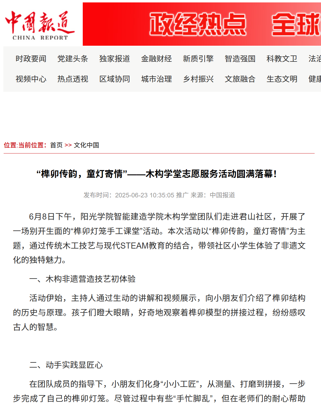 中国报道网:“榫卯传韵,童灯寄情 ”——木构学堂志愿服务活动圆满落幕!