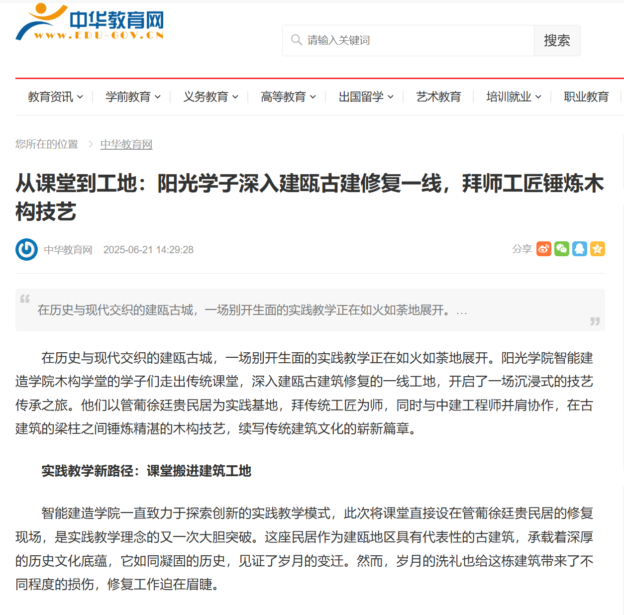 中华教育网:从课堂到工地:阳光学子深入建瓯古建修复一线,拜师工匠锤炼木构技艺