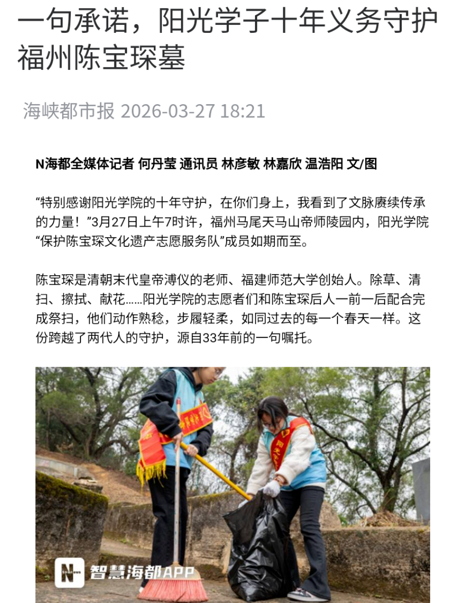 “特别感谢阳光学院的十年守护,在你们身上,我看到了文脉赓续传承的力量!”3月27日上午7时许,福州马尾天马山帝师陵园内,阳光学院“保护陈宝琛文化遗产志愿服务队”成员如期而至。