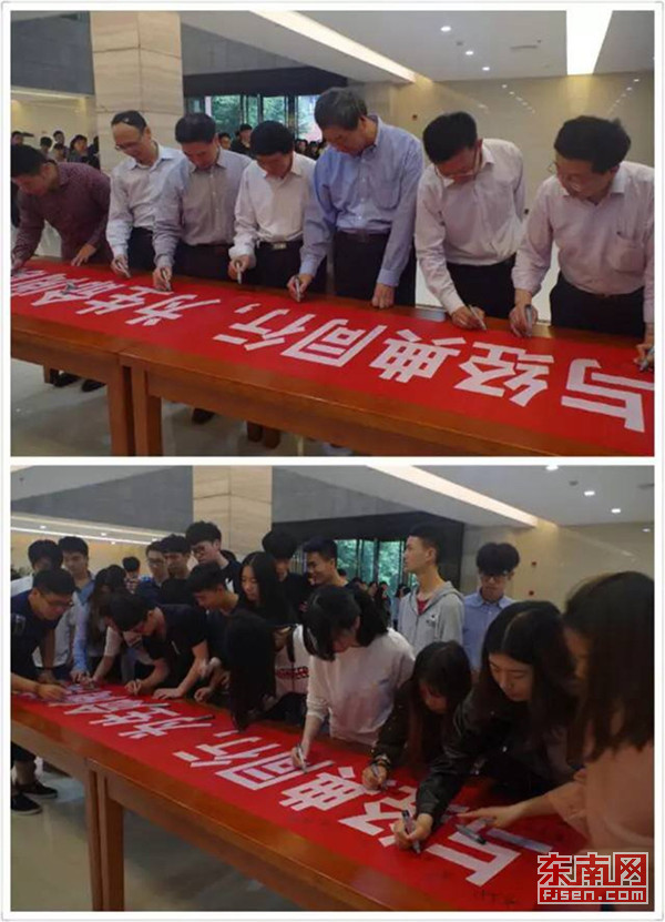 启动仪式中,校领导、系部领导代表向图书馆捐赠图书并与学生代表一起在“与经典同行,为生命阅读”的条幅上签名。