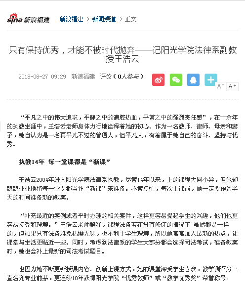 新浪福建6月27日讯 “平凡之中的伟大追求,平静之中的满腔热血,平常之中的强烈责任感”,在十余年的执教生涯中,王浩云老师身体力行地诠释着她的初心。作为一名教师、律师、母亲和妻子,她自认为是一名再平凡不过的普通人,但平凡人,有着属于她自己的奋斗、坚持与优秀。
