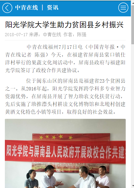 根据屏南县政府与阳光学院今天签订的共建协议,今后阳光学院将充分发挥综合性应用型高校多学科的专业优势,以项目建设的形式,为屏南县精准扶贫、乡村振兴提供智力助农服务。
