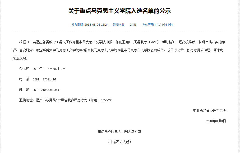 福建省教育厅8月6日讯 根据《中共福建省委教育工委关于做好重点马克思主义学院申报工作的通知》(闽委教思〔2018〕36号)精神,经高校推荐、材料审核、实地考评、会议研究,确定华侨大学马克思主义学院等6所高校马克思主义学院为重点马克思主义学院资助单位,现予以公示。如有意见或问题,可来电来函反映。