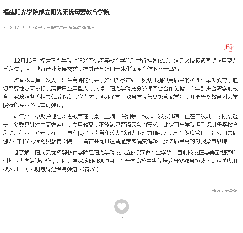 据了解,阳光无忧母婴教育学院是阳光学院校成立的第7家产业学院,目前该校正与美国堪萨斯州州立大学洽谈合作,共同开展家政EMBA项目,在全国高校中率先培养母婴教育领域的高素质应用型人才。(光明融媒记者高建进 张诗瑶)