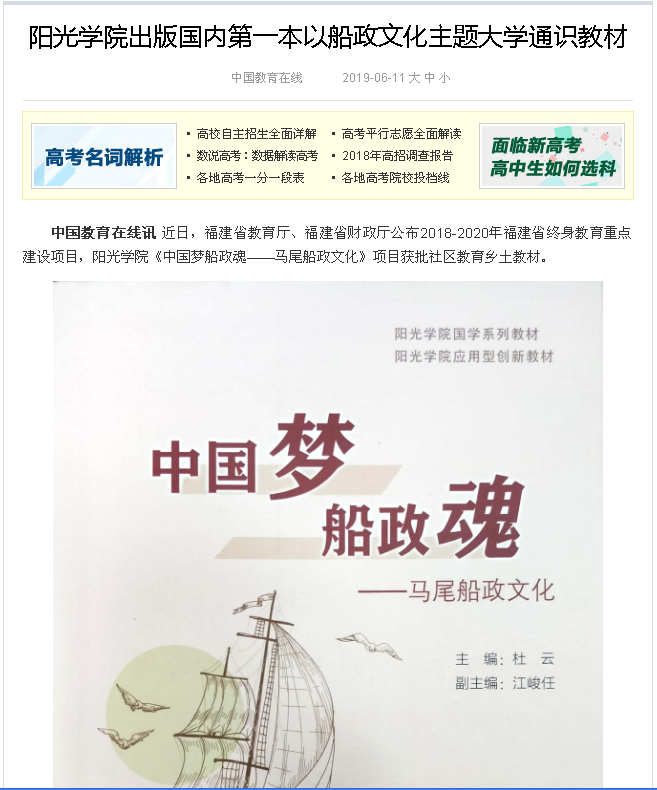 据了解,《中国梦船政魂——马尾船政文化》系阳光学院国学研究院教师团队历经6年打造的,是国内第一本以船政文化为主题的大学通识教材。全书分为8个专题,全面呈现了船政的缘起、人物、成果和历史借鉴意义,满足了船政文化教育需求,是我校国学教育服务地方文化建设的阶段性成果。该校专门开设了“船政文化”必修课,学生在校期间必须修满8课时0.5学分,以此让学生对船政文化的学习更具系统性、完整性和全面性。