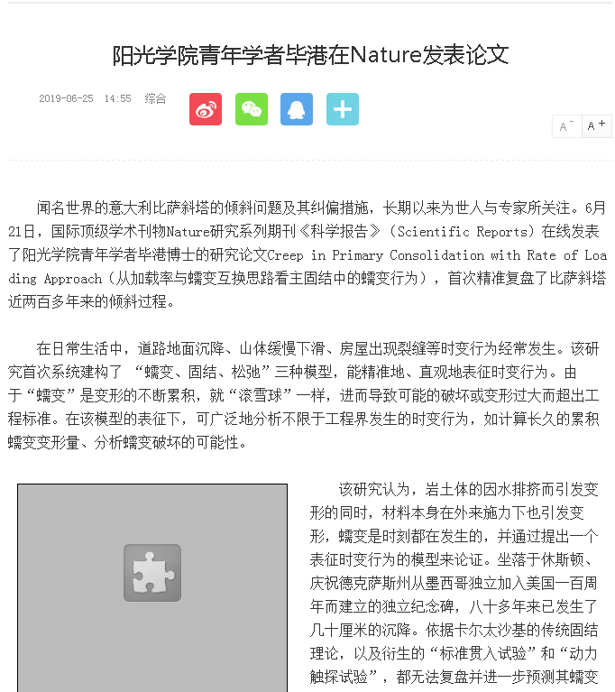 新浪福建6月25日讯 闻名世界的意大利比萨斜塔的倾斜问题及其纠偏措施,长期以来为世人与专家所关注。6月21日,国际顶级学术刊物Nature研究系列期刊《科学报告》(Scientific Reports)在线发表了阳光学院青年学者毕港博士的研究论文Creep in Primary Consolidation with Rate of Loading Approach(从加载率与蠕变互换思路看主固结中的蠕变行为),首次精准复盘了比萨斜塔近两百多年来的倾斜过程。