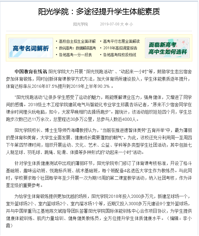 中国教育在线讯 阳光学院大力开展 “阳光悦跑活动” 、“动起来一小时”等,鼓励学生走出宿舍参加体育锻炼,同时创新体育课教学方式方法,加大体育场所建设投入,学生体能素质逐年提升,体育达标率从2016年87.5%提升到2019年上半年90.3% 。