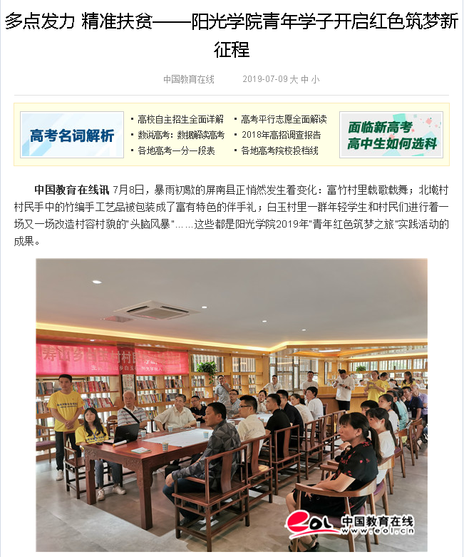 据介绍,今年暑假,阳光学院组织了33个不同专业的100多名师生组成18支“青年红色筑梦之旅”实践小分队,入驻北墘村、富竹村、白玉村,启动设计北墘孝文化馆设计、黄酒旅游伴手礼、白玉特色体育文化开发研究报告、村民导游员培训班、“筑梦·阳光”支教活动等18个项目,在提升乡村文化内涵、扩大乡村的知名度和影响力的同时,助推当地文化旅游等产业发展,为当地精准扶贫提供智力支持。