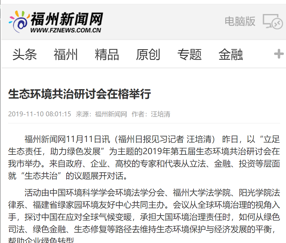 活动由中国环境科学学会环境法学分会、福州大学法学院、阳光学院法律系、福建省绿家园环境友好中心共同主办。会议从全球环境治理的视角入手,探讨中国在应对全球气候变暖,承担大国环境治理责任时,如何从绿色司法、绿色金融、生态修复等路径去维持生态环境保护与经济发展的平衡,帮助企业绿色转型。