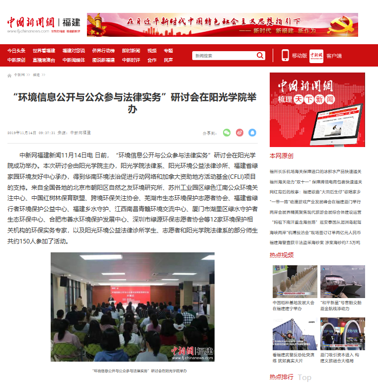 中新网福建新闻11月14日电 日前,“环境信息公开与公众参与法律实务”研讨会在阳光学院成功举办。本次研讨会由阳光学院主办,阳光学院法律系、阳光环境公益法律诊所、福建省绿家园环境友好中心承办,得到华南环境法治促进行动网络和加拿大资助地方活动基金(CFLI)项目的支持。来自全国各地的北京市朝阳区自然之友环境研究所、苏州工业园区绿色江南公众环境关注中心、中国红树林保育联盟、跨境环保关注协会、芜湖市生态环境保护志愿者协会、福建省绿行者环境保护公益中心、福建乡水守护、江西南昌青赣环境交流中心、厦门市湖里区绿水守护者生态环保中心、合肥市善水环境保护发展中心、深圳市绿源环保志愿者协会等12家环境保护相关机构的环保实务专家,以及阳光环境公益法律诊所学生、志愿者和阳光学院法律系的部分师生共约150人参加了活动。