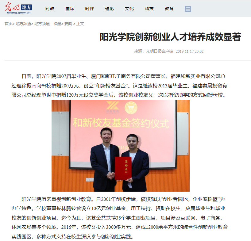 多年的坚持,让阳光学院在创新创业人才培养方面取得了显著成效。在福建省内跨境电商人群最为活跃的厦门市,已有多个阳光学院校友创办的跨境电商公司,其中厦门隆必达电子有限公司、厦门和新电子商务有限公司已成为该行业的翘楚。(光明日报全媒体记者刘成志、高建进)