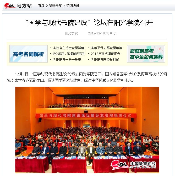 12月7日,“国学与现代书院建设”论坛在阳光学院召开。国内知名国学“大咖”及两岸高校相关领域专家学者齐聚卧龙山,畅谈国学研究与教育,探讨中华优秀文化传承新未来。