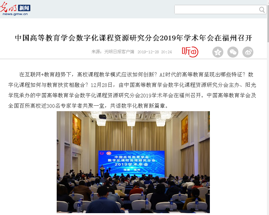 在互联网+教育趋势下,高校课程教学模式应该如何创新?AI时代的高等教育呈现出哪些特征?数字化课程如何与教育扶贫相融合?12月28日,由中国高等教育学会数字化课程资源研究分会主办、阳光学院承办的中国高等教育学会数字化课程资源研究分会2019学术年会在福州召开。中国高等教育学会及全国百所高校近300名专家学者共聚一堂,共话数字化教育新篇章。