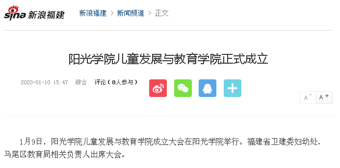 1月9日,阳光学院儿童发展与教育学院成立大会在阳光学院举行。福建省卫建委妇幼处、马尾区教育局相关负责人出席大会。