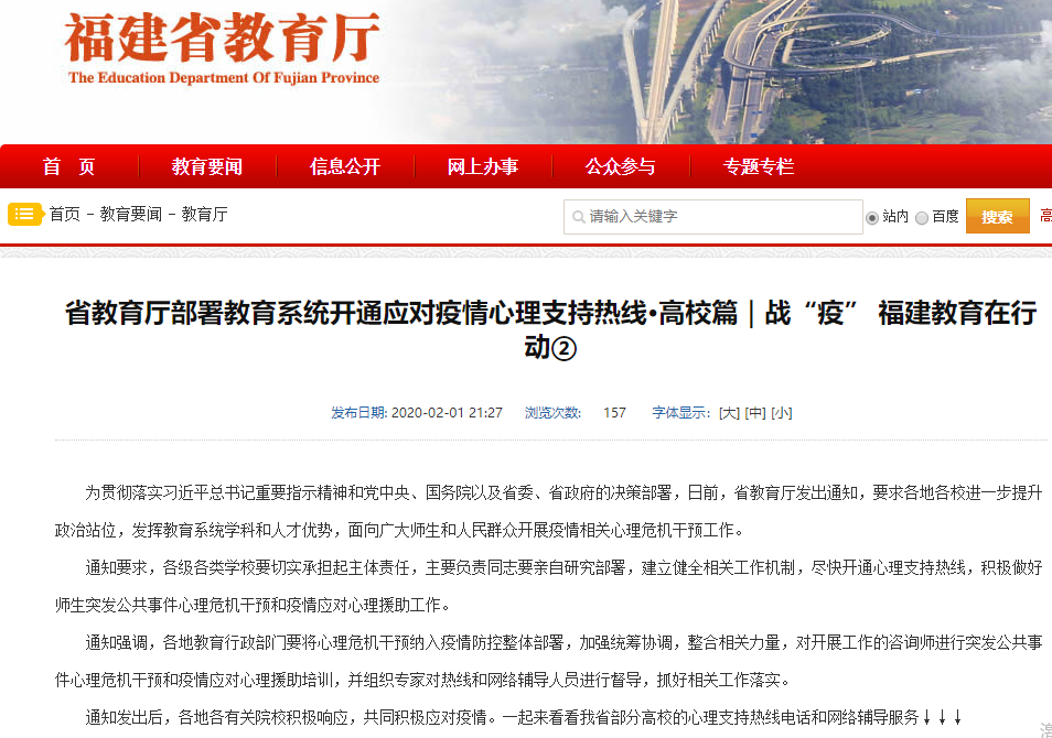 为贯彻落实习近平总书记重要指示精神和党中央、国务院以及省委、省政府的决策部署,日前,省教育厅发出通知,要求各地各校进一步提升政治站位,发挥教育系统学科和人才优势,面向广大师生和人民群众开展疫情相关心理危机干预工作。