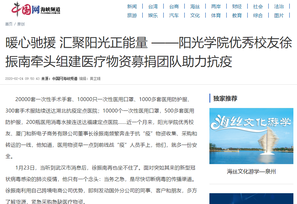 20000套一次性手术手套、10000只一次性医用口罩、1000多套医用防护服、300套手术服陆续送达湖北抗疫定点医院;10000个一次性医用口罩,500多套医用防护服,200瓶医用消毒水接连送达福建定点医院……近一个月来,阳光学院优秀校友、厦门和新电子商务有限公司董事长徐振南频繁奔走于抗“疫”物资收集、采购和转运的一线,他知道,医用物资早一点到前线战“疫”人员手上,他们,就多一份安全。