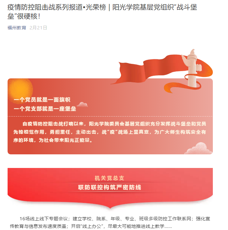 自疫情防控阻击战打响以来,阳光学院委员会基层党组织充分发挥战斗堡垒和党员先锋模范作用,勇担重任,主动出击,战“疫”战场上显真章,为广大师生构筑安全有序的环境,为社会带来阳光正能量。