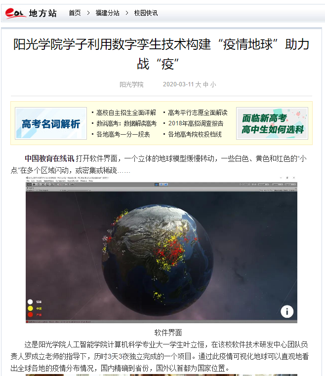 这是阳光学院人工智能学院计算机科学专业大一学生叶立恒,在该校软件技术研发中心团队负责人罗成立老师的指导下,历时3天3夜独立完成的一个项目。通过此疫情可视化地球可以直观地看出全球各地的疫情分布情况,国内精确到省份,国外以首都为国家位置。