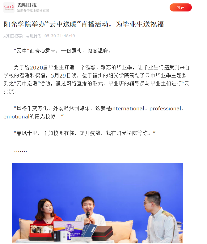 为了给2020届毕业生打造一个温馨、难忘的毕业季,让毕业生们感受到来自学校的温暖和祝福,5月29日晚,位于福州的阳光学院策划了云中毕业季主题系列之“云中送暖”活动,通过网络直播的形式,毕业班的辅导员与毕业生们进行“云交流。