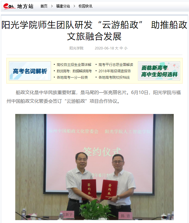 船政文化是中华民族重要财富,是马尾的一张亮丽名片。6月10日,阳光学院与福州中国船政文化管委会签订“云游船政”项目合作协议。
