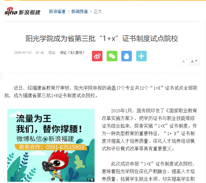 近日,经福建省教育厅审核,阳光学院申报的涵盖17个专业共12个“1+X”证书试点全部获批,成为福建省第三批1+X证书制度试点院校。