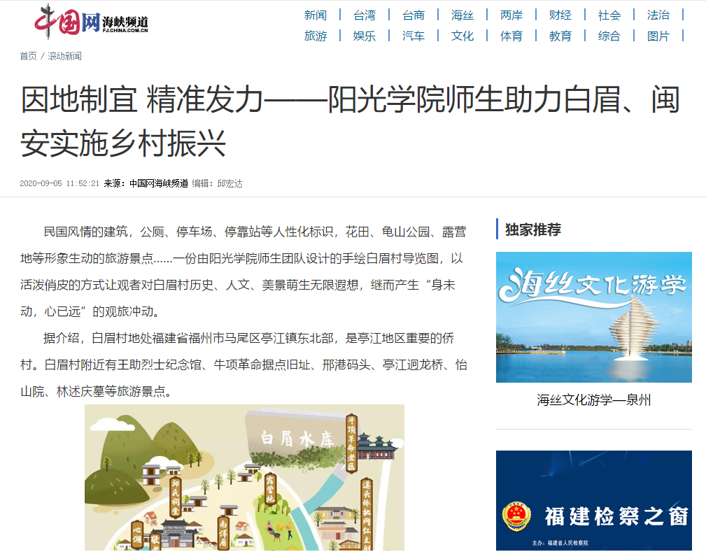 今年五月,阳光学院正式启动“助推闽安乡村振兴”实践育人工作,构建了景区导游讲解志愿者服务、打造文创基地、非物质文化遗产节目展演等多个项目同时发力,为进一步挖掘马尾区白眉村和闽安村两个地方的历史文化特色,助推当地经济发展。
