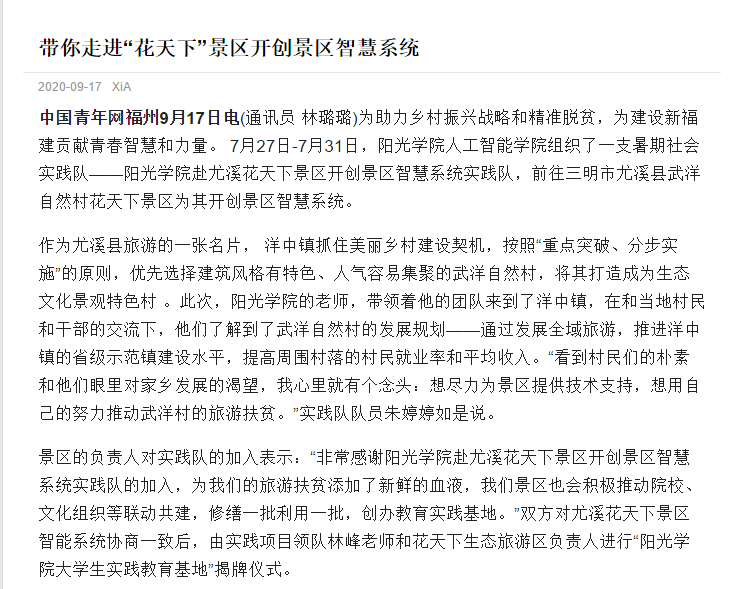 中国青年网福州9月17日电(通讯员 林璐璐)为助力乡村振兴战略和精准脱贫,为建设新福建贡献青春智慧和力量。 7月27日-7月31日,阳光学院人工智能学院组织了一支暑期社会实践队——阳光学院赴尤溪花天下景区开创景区智慧系统实践队,前往三明市尤溪县武洋自然村花天下景区为其开创景区智慧系统。