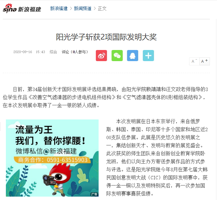 本次发明展在日本东京举行,来自俄罗斯、韩国、泰国、印尼等十多个国家和地区近200支队伍参展。此展是历史悠久的发明展之一,集结创新天才、发明与教育的展览盛会。此次获奖的师生团队来自创新创业教育学院卧龙班,他们以向主办方寄送参展作品的方式参与评选。这是阳光学院继今年8月在第七届大韩民国创意发明大战(CIC)的国际发明赛中,获得一金一铜以及发明特别奖后,再一次参加国际发明赛事喜获佳绩。