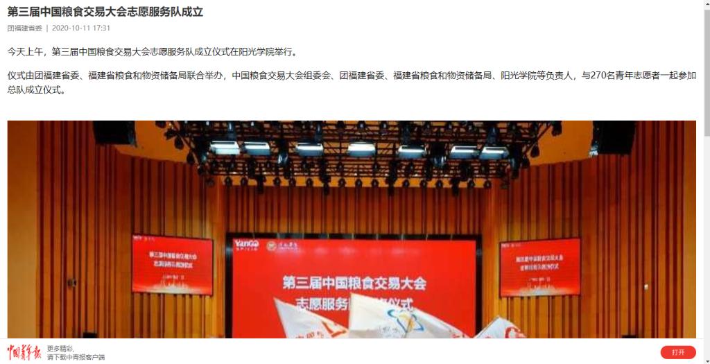 仪式由团福建省委、福建省粮食和物资储备局联合举办,中国粮食交易大会组委会、团福建省委、福建省粮食和物资储备局、阳光学院等负责人,与270名青年志愿者一起参加总队成立仪式。