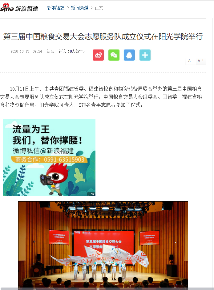 10月11日上午,由共青团福建省委、福建省粮食和物资储备局联合举办的第三届中国粮食交易大会志愿服务队成立仪式在阳光学院举行。中国粮食交易大会组委会、团省委、福建省粮食和物资储备局、阳光学院负责人,270名青年志愿者参加了仪式。