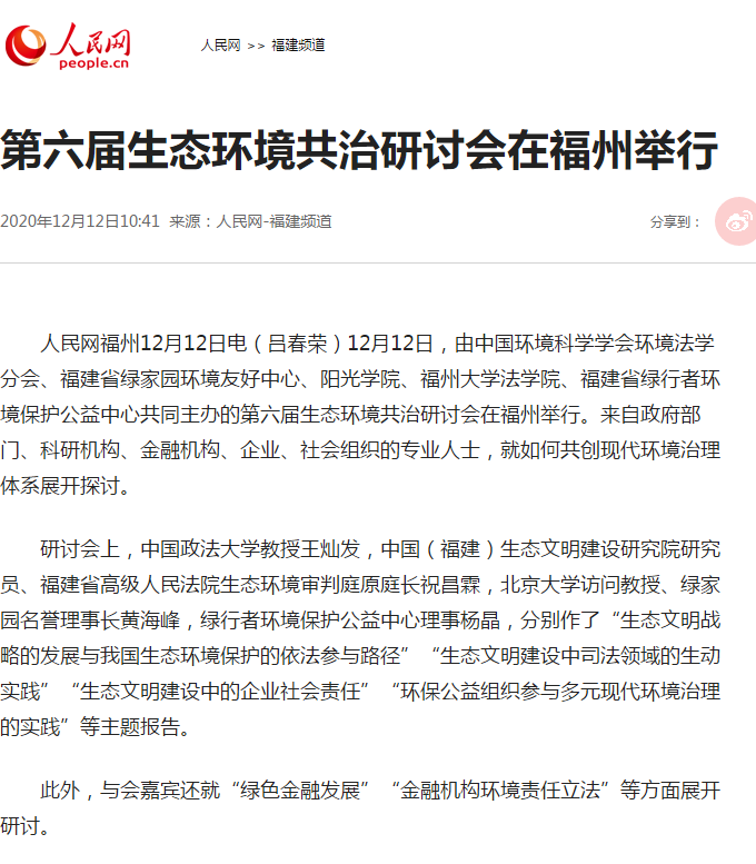 人民网福州12月12日电(吕春荣)12月12日,由中国环境科学学会环境法学分会、福建省绿家园环境友好中心、阳光学院、福州大学法学院、福建省绿行者环境保护公益中心共同主办的第六届生态环境共治研讨会在福州举行。来自政府部门、科研机构、金融机构、企业、社会组织的专业人士,就如何共创现代环境治理体系展开探讨。
