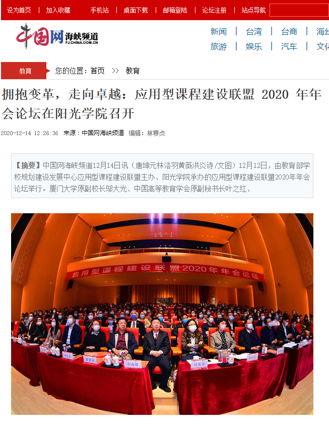 中国网海峡频道12月14日讯(唐坤元 林洛羽 黄薇 洪炎诗/文图)12月12日,由教育部学校规划建设发展中心应用型课程建设联盟主办、阳光学院承办的应用型课程建设联盟2020年年会论坛举行。厦门大学原副校长邬大光、中国高等教育学会原副秘书长叶之红、应用型课程建设联盟常务副理事长曹勇安、国家教育行政学院教务部主任刘亚荣、复旦大学教授张学新等专家应邀出席,来自全国各地100多所高校的近300名教师共赴盛会,共同探讨应用型课程改革的方向和方法。