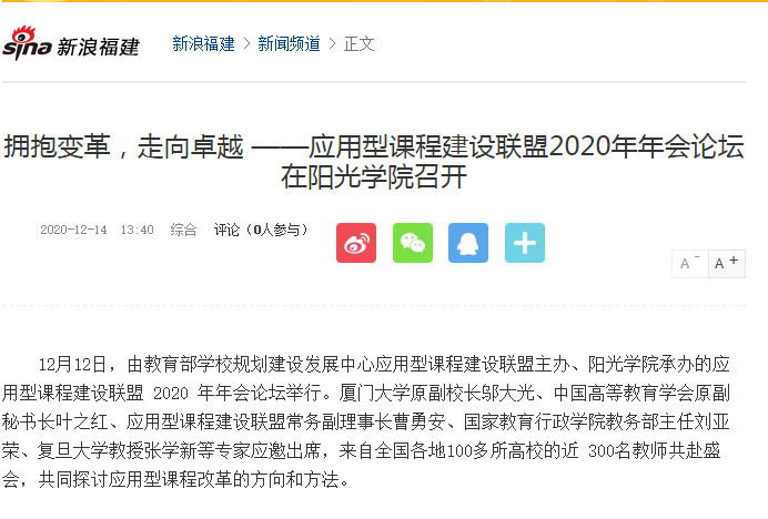 12月12日,由教育部学校规划建设发展中心应用型课程建设联盟主办、阳光学院承办的应用型课程建设联盟 2020 年年会论坛举行。厦门大学原副校长邬大光、中国高等教育学会原副秘书长叶之红、应用型课程建设联盟常务副理事长曹勇安、国家教育行政学院教务部主任刘亚荣、复旦大学教授张学新等专家应邀出席,来自全国各地100多所高校的近 300名教师共赴盛会,共同探讨应用型课程改革的方向和方法。在论坛上,我国著名教育家、百岁高龄潘懋元先生通过视频形式为论坛致辞。潘先生说,我国高等教育要从外延式发展转变为内涵式发展,内涵式发展有三个重要内涵:即课程、教学与教师。应用型课程建设联盟在组织课程建设过程中,团结众多教师,为高等教育内涵式发展发挥积极作用。