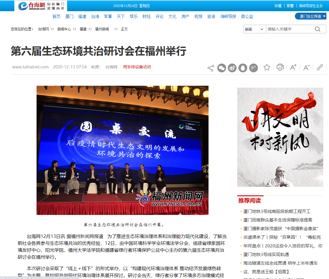 台海网12月13日讯 据福州新闻网报道 为了推进生态环境治理体系和治理能力现代化建设,了解当前社会各界参与生态环境共治的优秀经验,12日,由中国环境科学学会环境法学分会、福建省绿家园环境友好中心、阳光学院、福州大学法学院和福建省绿行者环境保护公益中心主办的第六届生态环境共治研讨会在福州举行。