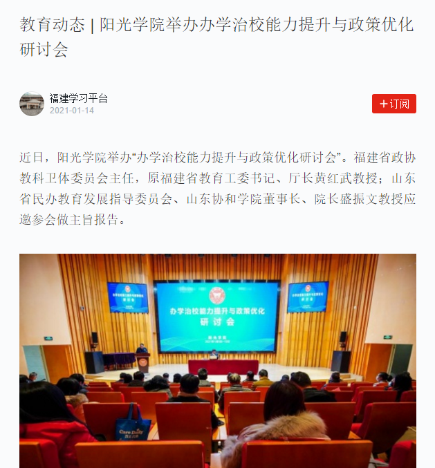 近日,阳光学院举办“办学治校能力提升与政策优化研讨会”。福建省政协教科卫体委员会主任,原福建省教育工委书记、厅长黄红武教授;山东省民办教育发展指导委员会、山东协和学院董事长、院长盛振文教授应邀参会做主旨报告。