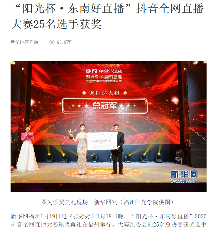 新华网福州1月19日电(张婷婷)1月18日晚,“阳光杯·东南好直播”2020抖音全网直播大赛颁奖典礼在福州举行。大赛组委会向25名总决赛获奖选手颁发奖杯、奖金、单项奖。