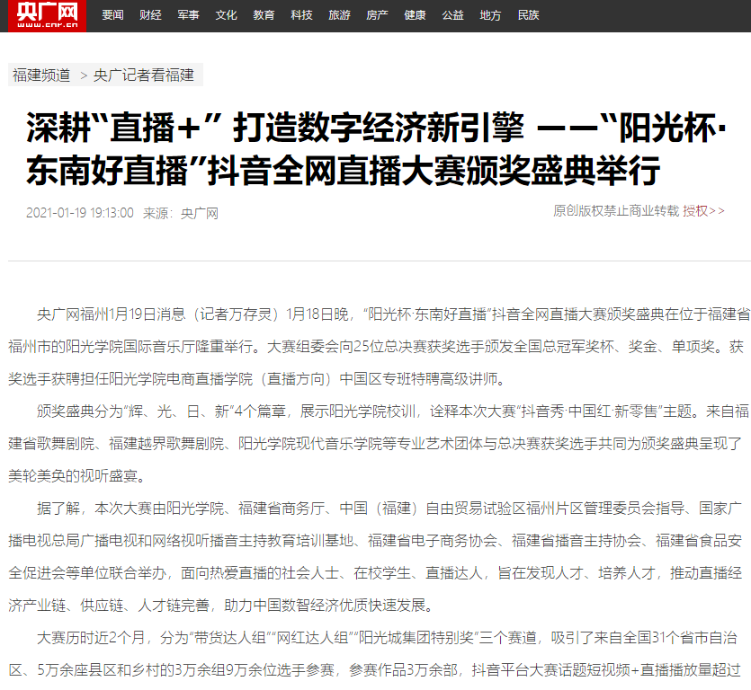 央广网福州1月19日消息(记者万存灵)1月18日晚,“阳光杯·东南好直播”抖音全网直播大赛颁奖盛典在位于福建省福州市的阳光学院国际音乐厅隆重举行。大赛组委会向25位总决赛获奖选手颁发全国总冠军奖杯、奖金、单项奖。获奖选手获聘担任阳光学院电商直播学院(直播方向)中国区专班特聘高级讲师。
